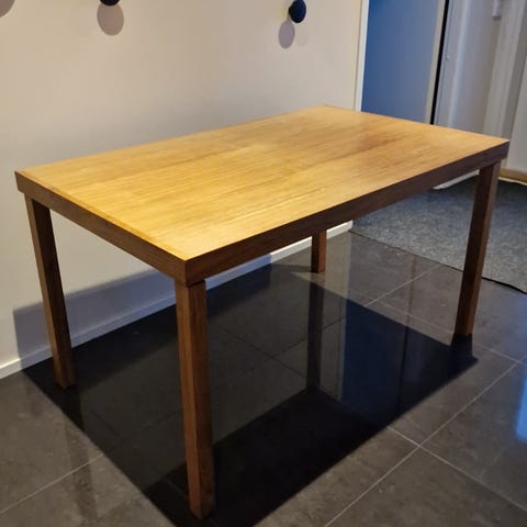 Kaunis pöytäliina ja neljän istuttava ehjä ja kunnollinen puinen ruokapöytä.