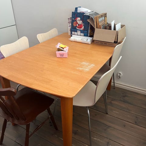 6 tuolia pinnat kuluneet. Yhden tuolin pinnassa iso tahra, koittanut poistaa esim kloriitilla mutta ei lähde.