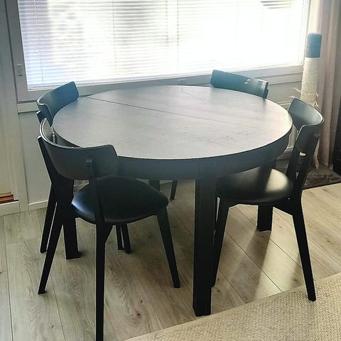 Pöydän ongelmat: vitkuu, saattaa tarvita kulmaraudat. Pöydän pinnassa osumaa ja ns ikitahroja (pinta imee nopeasti esim ketsupin). Yhtä jalkaa ei saa irti.