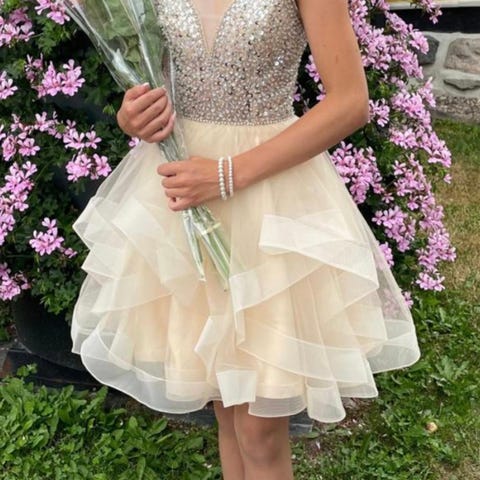 Zazabella juhla- tai rippimekko, koko XXS. Mekko on beigenväristä satiinia ja siinä on lyhyehkö, leveähelmainen malli. Yläosa on istuva ja siinä on ohuet olkaimet. Selässä on nyöritys, jonka avulla istuvuutta voi säätää. Vyötäröllä kulkee koristeellinen kivireunus. Helmassa on taskut. Sopii juhla- ja cocktailkäyttöön.
