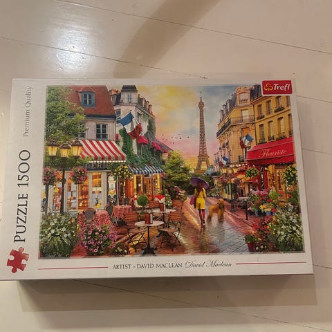 Trefl-, Ravensburger- ja Tactic-merkkiset palapelit, joissa on 500–1000 palaa. Kuvat esittävät erilaisia maisema- ja kaupunkinäkymiä, kuten siltoja ja rakennuksia, sekä kuvitusaiheita. Pakkauksissa on merkitty palamäärä ja valmistajan tiedot. Palapelit on pakattu alkuperäisiin laatikoihin. Palapeleissä on kaikki palat tallella.