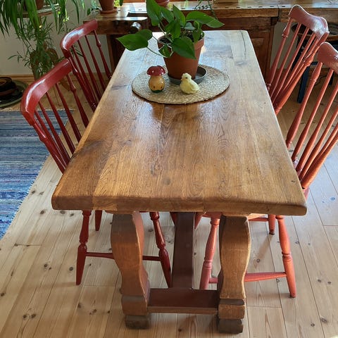 Ruokailuryhmä puinen ruokapöytä ja tuolit 1900-luvun alkupuolelta