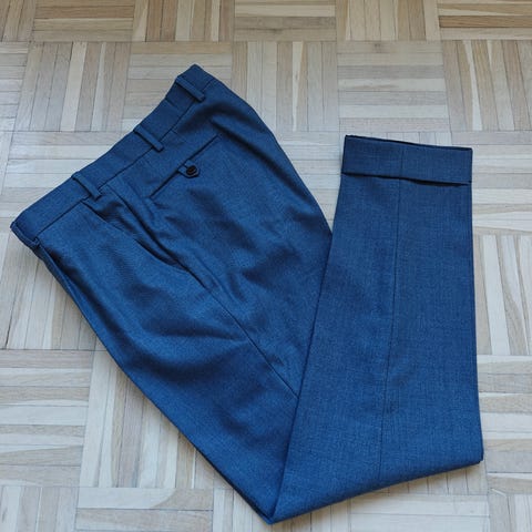Ball miesten villahousut, koko 50. Tummansininen -harma housut, joissa hienojakoinen kuviointi. Materiaalina villa. Housuissa vyölenkit ja etukiinnitys napilla ja vetoketjulla. Sopivat esimerkiksi arki- ja siistimpään pukeutumiseen.