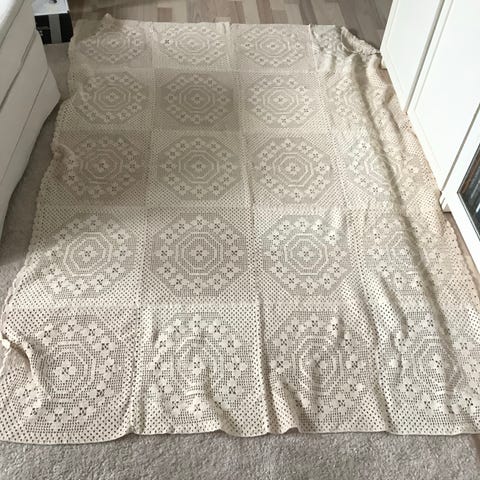 Neliöistä käsinvirkattu uniikki päiväpeitto. Sopii myös verhoksi. Materiaali luonnonväristä kalalankaa. Ei ole ollut käytössä. Maksutapa Mobilepay. Ostaja maksaa postimaksun 10,90 €.