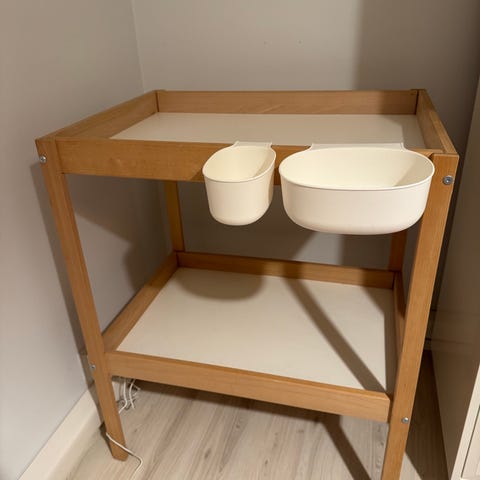 IKEAn hoitopöytä. Pöydässä on ylhäällä hoitotaso ja alhaalla avoin hylly vaippojen ja tarvikkeiden säilytykseen.