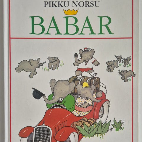 Jean de Brunhoff Matkaan Babar lastenkirja. Suomennettu kuvakirja, jossa seurataan norsu Babarin ja hänen perheensä matkaa ja seikkailuja eri ympäristöissä. Kirjassa on runsaasti värikuvitusta ja teksti on taitettu selkeisiin kappaleisiin. Sopii ääneenluettavaksi ja itse luettavaksi lukemaan opetteleville lapsille. Kirjan kieli on suomi ja hahmona on tuttu Babar-norsu tarinoineen.