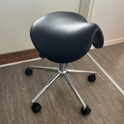 Laadukas Softrend Hubert -design tuoli. Lev. 34 cm, syvyys 49 cm, korkeus 82 cm, istumakorkeus 60 cm. Tuolissa keinujalka massiivitammea. Kangas laadukasta, kestävää ja paloturvallista.Uutta vastaava. Sopii erinomaisesti työtuoliksi satulatuolin tapaan. Korkea aktiivituoli tukee kehon aktiivisuutta, ja siitä on nopea nousta seisomaan.