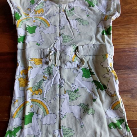 Mekko, jossa niskassa nappikiinnitys, pienet röyhelöhihat ja yksisarviskuvioita. Edessä pieni reikä (kuva) joka ei ole haitannut käytössä, koska juuri ei näy.