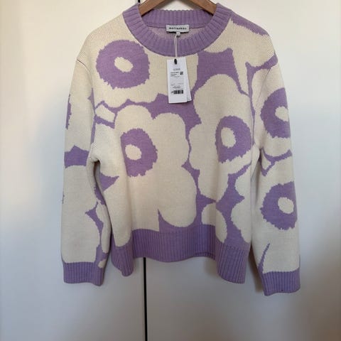 Uudenveroinen Marimekon sesonki unikkoneule, koko L. Istuvuus on väljä ja malli on suora. Materiaali on 100% puuvilla ja ostettu alunperin Marimekon liikkeestä.
