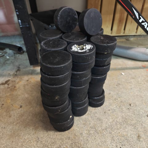 Perinteiset kumikiekot. 3 aikuisten ja 3 lasten minikiekkoa. Kaikki yhteensä 2e.