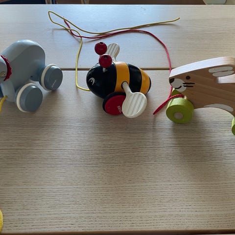 Jo muutaman lapsen leikkimät Brion vetolelut. Toimivat edelleen hyvin, kolhuja ja leikin jälkiä toki on.