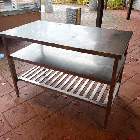 Ruostumattomasta teräksestä valmistettu työtaso, jossa on integroitu pesuallas toisessa päässä tasoa. Tasossa on suuri yhtenäinen työskentelypinta ja altaan vieressä laskutilaa. Rakenteessa on avoin ritilämäinen alahylly, joka soveltuu esimerkiksi astioiden, laatikoiden tai tarvikkeiden säilytykseen. Soveltuu keittiöön, työtilaan tai muuhuun käyttöön, jossa tarvitaan kestävää ja helposti puhdistettavaa ruostumattoman teräksen työpintaa ja allasta.