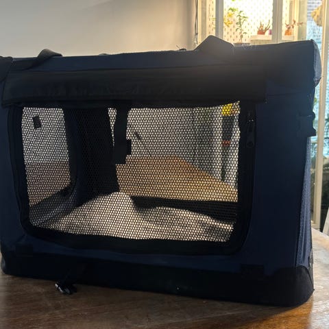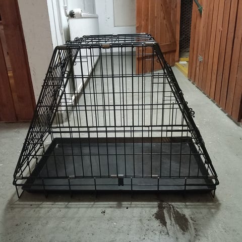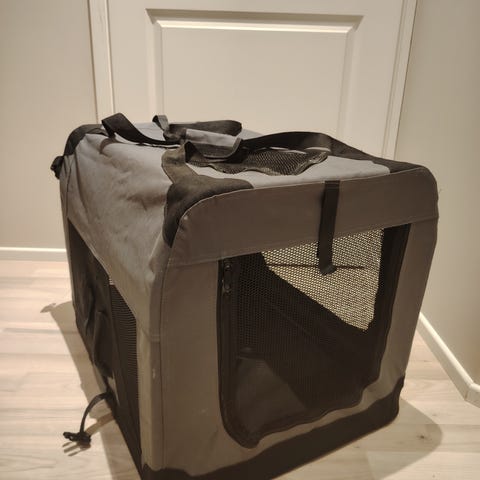 Pieni, metallinen, kokoontaitettava kevythäkki. Ovi päädyssä. Mitat: 44,5cm x 29,5 cm x 35 cm. Viimeinen on korkeus.