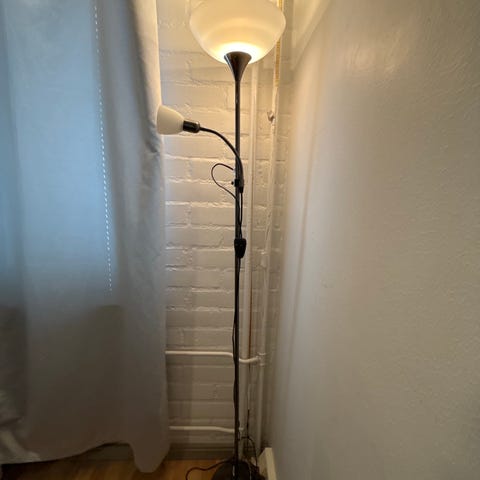 Lampunvarjostin riisipaperia ja siinä parissa kohtaa pieni repeämä sekä yhdellä sivulla pieniä roiskeita (katso kuvat). Näitä ei lampun päällä ollessa huomaa. Korkeus n. 150 cm. Sisällä kolme lamppua tulevat mukana.