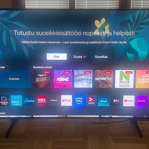 Netflix, Yleareena, Youtube, Apple Tv, Disney+, Prime Video, Viaplay, Rakuuten, Ruutu, Mtv ja monia muita sovelluksia voidaan asentaa tarvittaessa.
