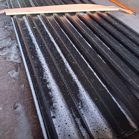 Puista tehdasmaalattua valkoista päätypontattua kattopanelia. 8 paneelia. Pituus 510cm. Hinta yhteensä 20e. Nouto Ilmajoen Koskenkorvalta.