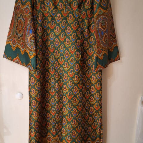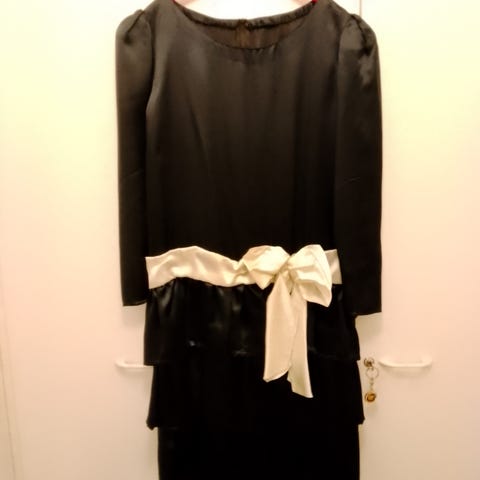 Naisten täyspitkästä iltapuvusta ompelimossa lyhennetty mekko. Kai-kai 50 cm, niska-helma n. 105 cm. Lemmikkitalous.