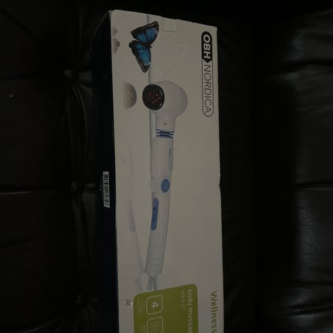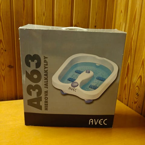 OBH Nordica foot spa blue-white. The device has massaging rollers for the soles of the feet, a nub base and an infrared light in the middle. The front has a rotary selector for different operating modes, such as bubbles and heating. The MAX water level is marked on the inside. Suitable for soaking feet and relaxing foot baths at home.