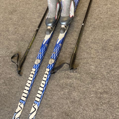 Myydään suksipaketti. Sukset 140 cm, NNN siteillä. Sauvat 105 cm.