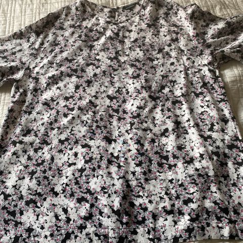 Marimekko pusero naisille, koko 42. Materiaalina viskoosi. Kuosina mustavalkoinen, kirjavaksi luokiteltava kukkakuvio. Puserossa on 3/4 hihat. Huolto-ohjeet löytyvät vaatteen pesulapusta.