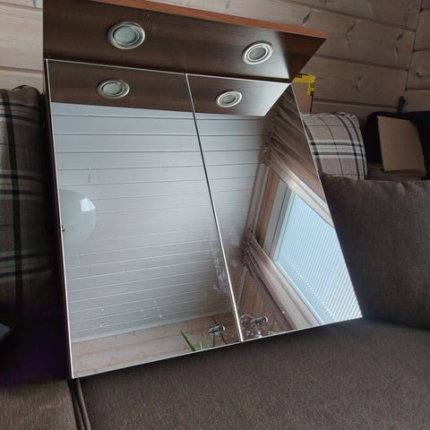 Svedbergs kylpyhuoneen peilikaappi valkoinen. Kaapissa on peiliovi ja valkoinen runko sekä metallinen vetokahva. Sisäpuolella on tilaa hyllyille pienille tarvikkeille. Kaappi on seinään kiinnitettävä ja siinä on sähköjohto yläosassa, mikä viittaa mahdollisuuteen liittää valaistus tai pistorasia kaapin yhteyteen. Sopii kylpyhuoneeseen tai wc-tilaan säilytys- ja peiliratkaisuksi. Peilikaapin koko leveys 46 senttimetriä, korkeus 70 senttimetriä, syvyys 13 senttimetriä. Kaapin korkeus 123,5 senttimetriä, leveys 30,5 senttimetriä ja syvyys 35,5 senttimetriä. Huom! Sijaitsee Kotkassa.