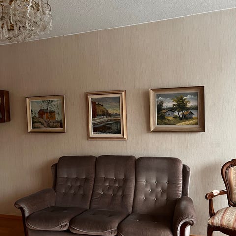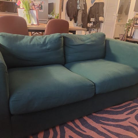 Kahden istuttava sohva, 135cm leveä. Yleisilme siisti, pientä kulumaa on. Nouto viimeistään 25.2.2026.
