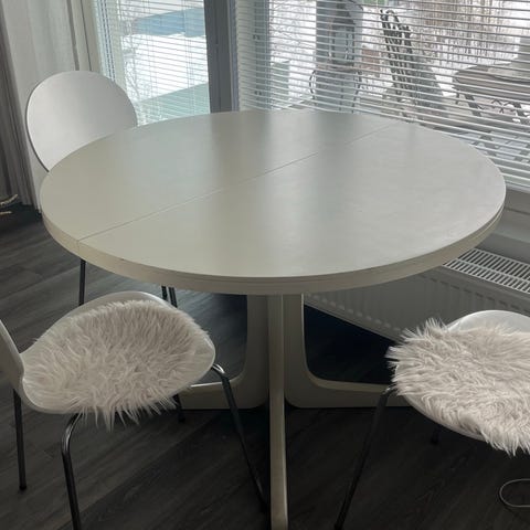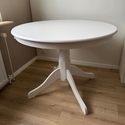 Pyöreä ruokapöytä valkoisella pinnalla ja puisilla jaloilla.