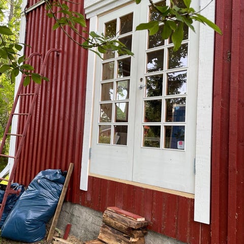 Valkoinen ulko-ovi, jossa neliruutuinen lasiaukko yläosassa ja peilirakenne alaosassa. Ovi on oikeakätinen ja siihen kuuluu puinen karmipaketti, jonka mitat ovat noin 100x210 cm (viitaten tarrassa näkyvään kokomerkintään 1000x2100). Ovi soveltuu ulko- tai varasto-oveksi tiloihin, joissa tarvitaan valoa läpäisevä lasi-ikkuna. Karmit ja kynnys sisältyvät kokonaisuuteen kuvien mukaisesti.