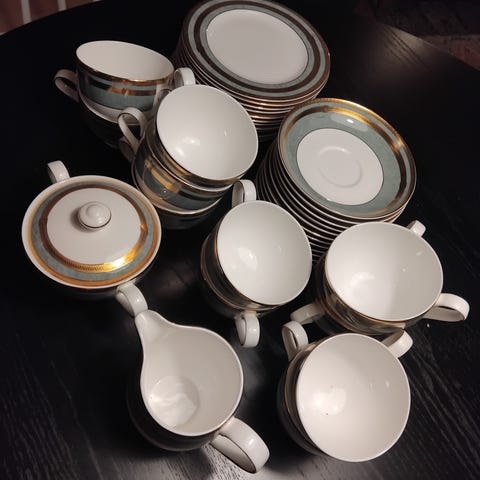 Myydään tilanpuutteen vuoksi 76-osainen Royal Bone Emerald astiasto. Täydellinen kahvi- ja ruoka-astiasto. Vain satunnaisesti käytetty. Ei naarmuja. Kaikki astiat ehjiä. Jokaisessa on kullatut reunukset. Koko astiasto yhteensä 300 €.