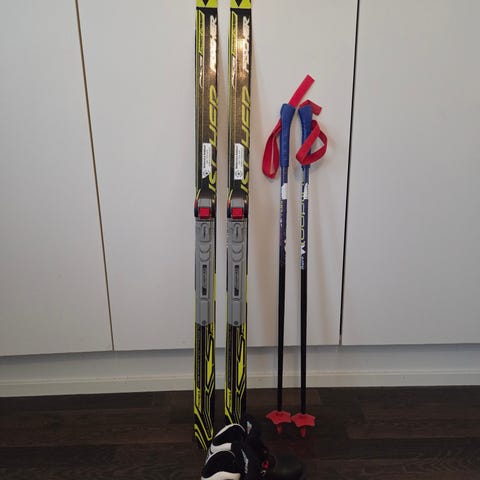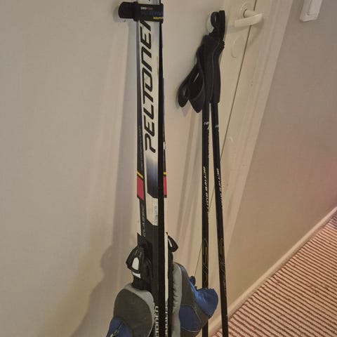 Lasten maastohiihtosetti, sukset Atomic Ski Tiger 110cm, side Atomic SNS, monot Atomic SNS koko 30.5 (sisämitta 18.5 cm), sauvat One way 80cm.