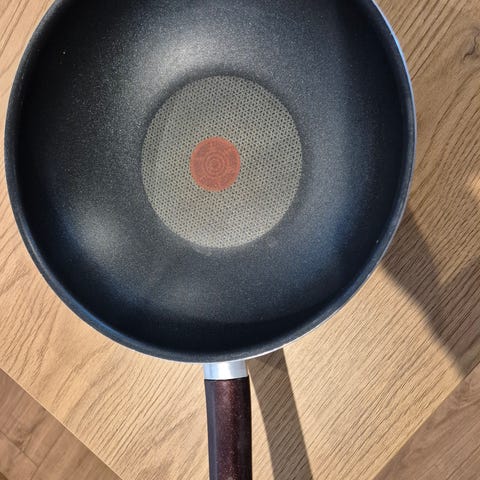 Isokokoinen wokkipannu paksulla, noin 2cm vahvuisella pohjalla. Painava mutta helposti käsiteltävä. Merkki muistaakseni Eurolux. Todella hyvässä kunnossa eikä ruoka tartu kiinni. Myyntiin, koska ei toiminut induktioliedellä.