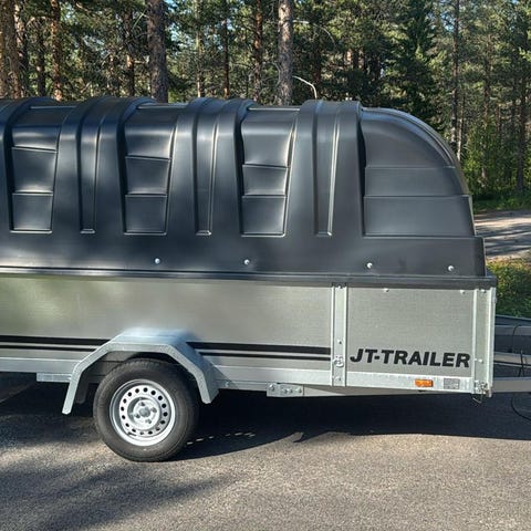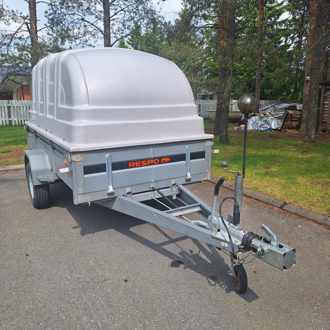 AK-Trailer 3250 peräkärry kuomulla. Sinkitty metallirunko ja harmaa kuomu. Yksakselinen malli, jossa vetoaisa.