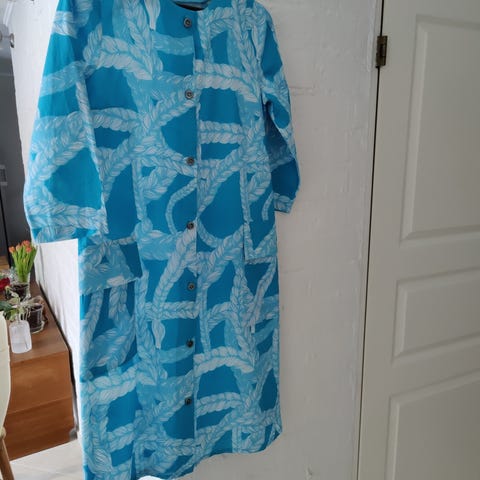 Vimma arkimekko naisille, koko L. Materiaalina viskoosi. Värinä valko-/vihreä sävyinen kuosikangas, pitkät hihat ja nappikiinnitys yläosassa. Helma on väljä ja laskeutuva, hihansuissa ja helmassa on kevyt röyhelö. Kts kuvat muutama pikkuvika.