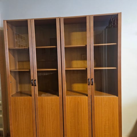 Upea 50-60 luvun vitriini lasihyllyillä.