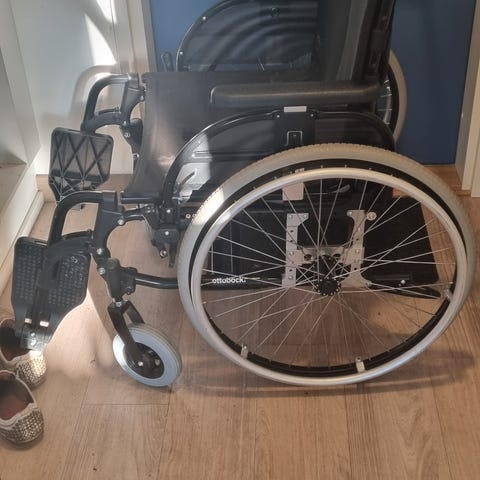 Rehasense pyörätuoli musta. Manuaalinen pyörätuoli, jossa on suuret takapyörät käsivanteilla ja isot etupyörät. Istuinosassa ja selkänojassa on musta kangasverhoilu. Käsinojat ovat irroitettavissa ja jalkatuet kääntyvät sivuun ja ovat irrotettavat. Takana on työntökahvat avustajaa varten sekä jarrut takapyörille. Soveltuu aikuisen liikkumisen avuksi sisä- ja ulkokäyttöön. Ammattilaatua soveltuu myöd hoivakoti ja kuntoutuskäyttöön. Uutta vastaava. Kotiinkuljetus mahdollisuus.