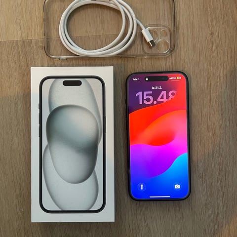 Apple iPhone 15 plus älypuhelin, tallennustila 128 GB. Ollut työpuhelimena 2 v todella vähällä käytöllä. Siksi naarmuton kolhuton ja akkukin on kuin uusi 99 %. Panssarilasi ollut uudesta asti. Myös silikonikuoret mukaan. Maksu mobilepaylla. Myös postitus onnistuu sovittaessa.
