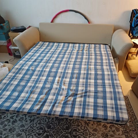 Muutaman vuoden vanha Maskun vuodesohva, mukaan saa kuvassa näkyvät lisäpäälliset. Raapimajälkiä ja tahroja, jälkimmäisiin pitäisi tekstiilipesurin purra. Levitysosa hieman notkollaan, joku poikkipuu murtunut, toimii silti petarin kanssa nukkumapaikkana.