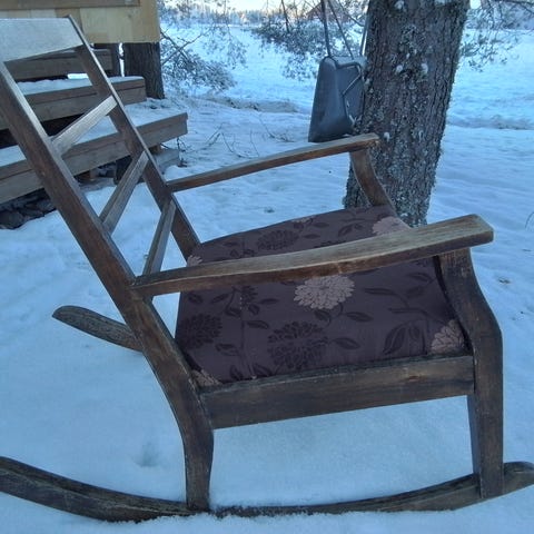 Upea keinutuoli! Ei nitise tai natise, kaikki osat tukevasti kiinni. Maalattu valkoisella mattapintaisella kalustemaalilla.