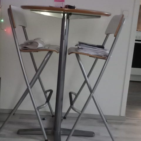 Valkoinen kahdenistuttava ruokapöytä 36cmx36cm hopeanvärisillä jaloilla ja kaksi nahkatuolia hopeanvärisillä jalaksilla.