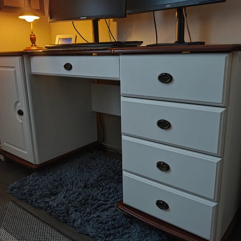 Hyväkuntoinen valkoinen työpöytä, ulosvedettävällä sivutasolla