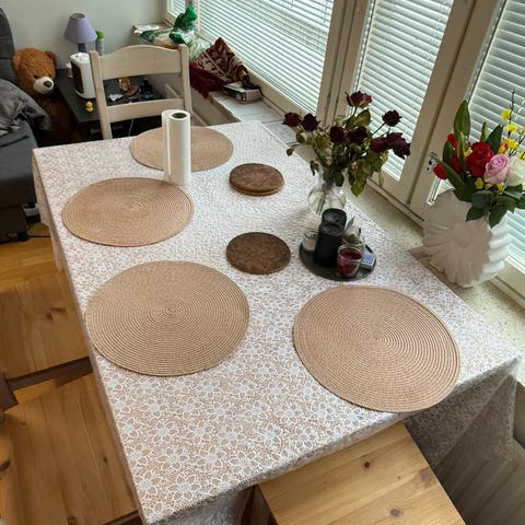 Nyt olisi pöytä mielestäni mitoilla 140x80. Tuoleja ei tule mukana vain pöytä kaipaa vain putsausta muuten ihan hyvässä kunnossa.