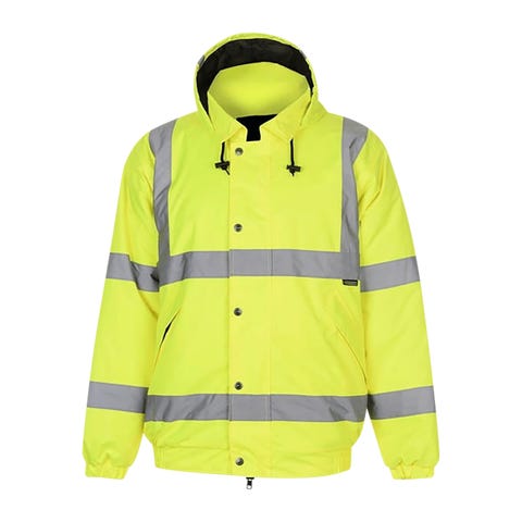 Bomber-takki, jossa on HiVis-yksityiskohtia, heijastavat raidat ja fluoresoiva malli. Säädettävä alas rullattava huppu, jossa kiristysnyörit. Joustava vyötärö ja hihansuut. Pysy näkyvissä ja turvassa Dunlop Hi-Vis Bomber-takissa. Takissa on heijastavat raidat ja fluoresoiva malli, joka parantaa näkyvyyttä työympäristöissä.Siinä on säädettävä alas rullattava huppu, jossa on kiristysnyörit, sekä joustava vyötärö ja hihansuut, jotka takaavat erinomaisen istuvuuden. Pehmustettu vuori ja useat käytännölliset taskut tekevät siitä sekä käytännöllisen että mukavan.Yksityiskohdat:- Hi-vis-takki.- Vettä hylkivä- Heijastavat raidat- Fluoresoiva malli- Vetoketjullinen sisätasku- Kaksi vetoketjullista ulkotaskua- Kudottu Dunlop-merkki- Säädettävä huppu- Pehmustettu sisäpuoli- Vetoketju sisällä säätämiseen itselle sopivaksi- Täyspitkä vetoketju piilotetulla läpällä ja napeilla- Joustava vyötärö ja hihansuut- 100 % polyesteriä
