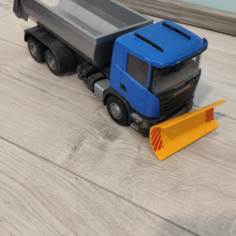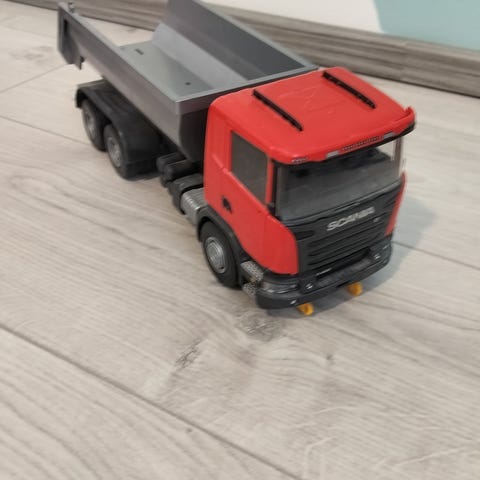 Emek lelu-kuorma-auto, jossa irrotettava punainen lava sekä erillinen sininen vaihtolava. Peilit puuttuvat.
