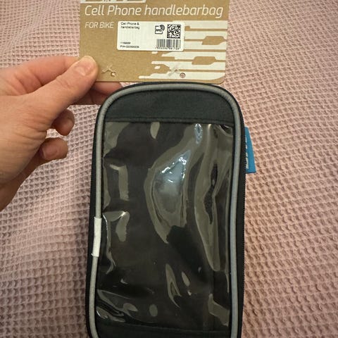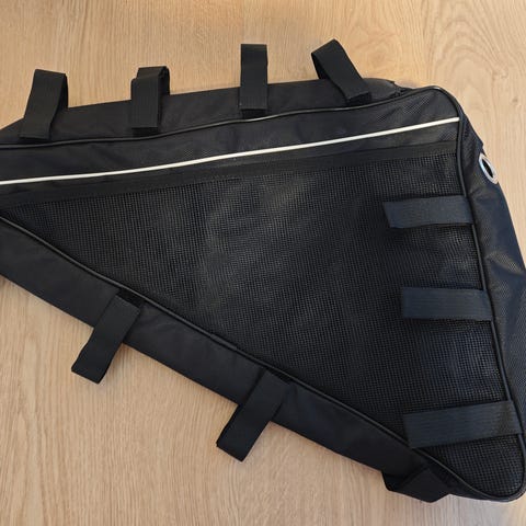pyörän runkolaukku, jossa läpinäkyvä kosketusnäyttötasku älypuhelimelle. Laukku kiinnitetään pyörän ohjaustankoon hihnoilla. Väri on musta. Laukussa on vetoketjullinen päälokero pientarvikkeille, kuten avaimille, lompakolle tai työkaluille.