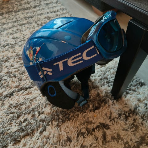 Laskettelukypärä ja lasit. Koko.xs/s 48-54cm. Naarmuja jonkin verran mutta ehjä.