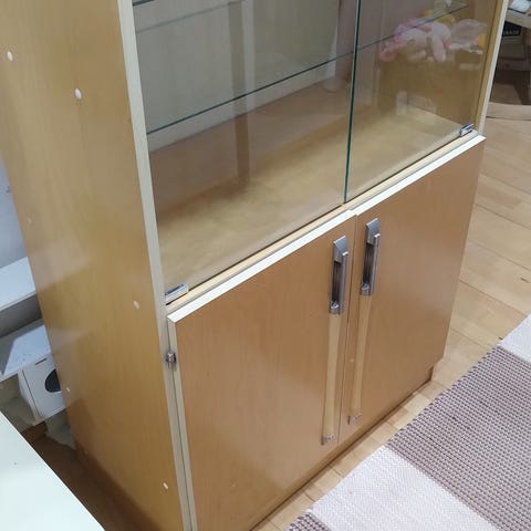 Myydään siistikuntoinen puinen funkkistyylinen vitriinikaappi, jossa lasiovet ja kolme muunneltava hyllytasoa. Sopii hyvin esimerkiksi astioille, koriste-esineille tai kirjoille. Tukeva rakenne ja ajaton ulkonäkö.