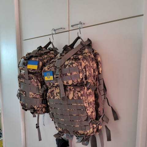 Paljon lokeroita. Sini/ harmaa. Leveät olkahihnat. Pohjassa muovitassut.