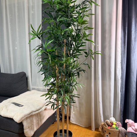 Kare Design korkea tekokasvi, joka muistuttaa bambua. Kasvi on istutettu mustaan ruukkuun.