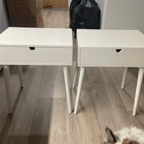 Valkoiset yöpöydät, joissa on yksi vetolaatikko ja avoin hyllyosa. Pöydissä on suorakulmainen kansi ja neljä suoraa jalkaa. Sopivat esimerkiksi sängyn viereen säilytykseen ja laskutasoksi. Myydään parina kuvien mukaisessa kunnossa.