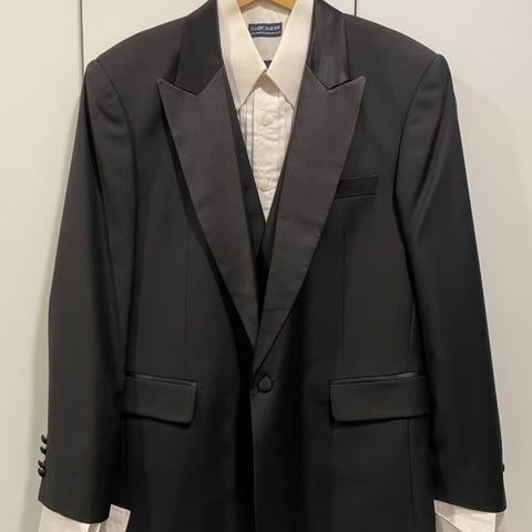 Miesten smokki koko L/XL katso mitat kuvista. Musta kaksiosainen puku, jossa takki ja housut. Materiaali on villaa. Takissa on sileä kauluskäänne ja rintatasku, housuissa suorat lahkeet. Väri tasainen musta.